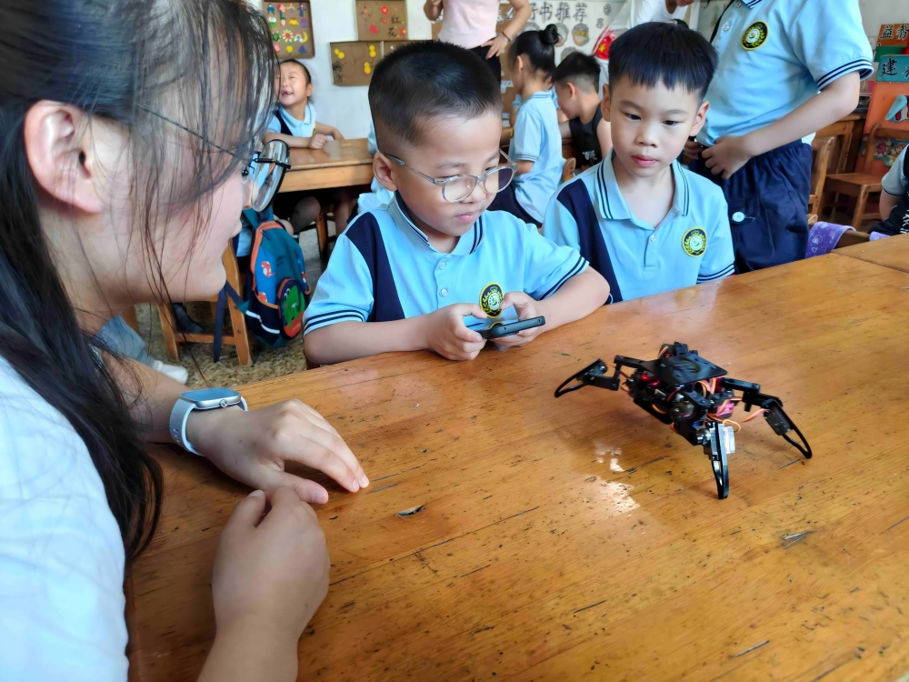 在志愿者的指导下,孩子们小心翼翼地操控着机器人,看着机器人完成前进、转弯等动作,教室里不时响起阵阵欢呼。“我以后也要造机器人!”许多孩子在成功操控机器人后,眼神里充满了兴奋,说出了未来美好的期盼。