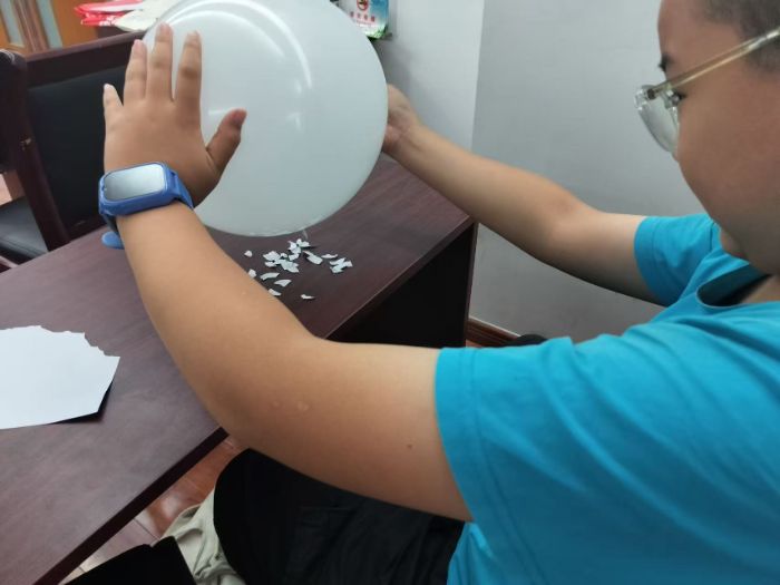 随后进行的“风的魔力”科学实验更是将现场气氛推向高潮。志愿者们将彩色纸花分发给每个孩子,示范如何用头发摩擦气球产生静电。当看到纸花被气球神奇吸附、轻轻飞舞时,孩子们围在实验桌前,小脑袋凑在一起目不转睛地盯着,不时发出“哇”的惊叹声。志愿者趁机用简单比喻讲解静电吸附的原理:“就像诗句里月亮吸引着李白的目光,气球也用‘看不见的力量’吸引着纸花哦。”孩子们跃跃欲试,在志愿者的指导下纷纷拿起气球和纸花动手实验,成功时的欢呼声响彻教室。“原来生活中有这么多好玩的科学知识!”小朋友王同学举着吸附着纸花的气球兴奋地说道。