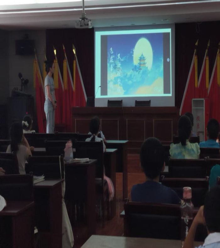 以诗为媒巧引导 童声点亮古诗课堂 活动开场,志愿者们围绕月亮主题展开提问,试图引导孩子们说出描写月亮的古诗。面对低年级孩子们略显懵懂的神情,志愿者们迅速转变策略。他们先在黑板上画出李白的简笔画像,用生动语言介绍这些孩子们较为熟悉的大诗人,接着以李白的《静夜思》作为突破口。当志愿者轻轻念出“举头望明月”,孩子们立刻齐声接道“低头思故乡”,清脆的童声让现场气氛瞬间被点燃。借由这份熟悉感,志愿者们顺势在投影幕布上展示《古朗月行》的诗句,逐字标注拼音,用抑扬顿挫的朗读声带领孩子们走进诗歌意境。孩子们仿佛穿越千年时光,与诗人一同站在洒满月光的庭院,感受着那纯真质朴的童趣与对浩瀚星空的无限遐想。