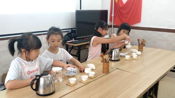 结营仪式开场,清幽茶香点亮氛围。小朋友端坐茶席,洗茶专注、注水平稳、奉茶恭敬,一招一式尽显认真。初学时他们对茶艺一知半解,如今已能流畅完成整套流程。温茶入杯,孩童身影藏传统文化生动模样,茶香里,文化种子于夏萌芽扎根。