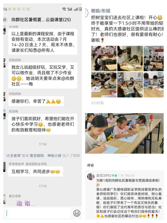 家长们对我们此次三下乡活动非常满意,家长们表示:“盛夏的支教路上有你们无私奉献,是我们的福气,我们孩子交到你们手中我们放心,希望你们能多开展这个工作,对我们孩子发展有和很大帮助,提高孩子们对传统文化认知以及丰富孩子们德智体美劳全面发展等,希望社区多组织这些活动。非常感谢向群社区和经管筑梦队。”
