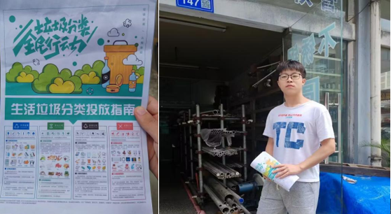志愿者手持“生活垃圾分类投放指南”海报,向社区居民开展宣传 刘嘉峻 供图