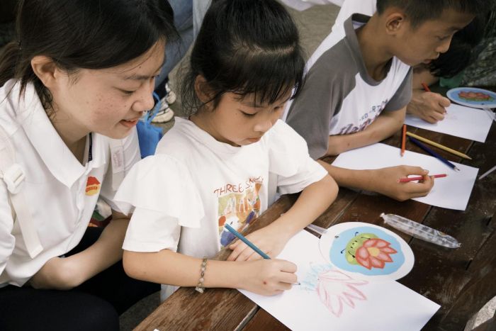 实践团成员与小朋友们进行廉洁课堂绘画(黄禾茵摄)