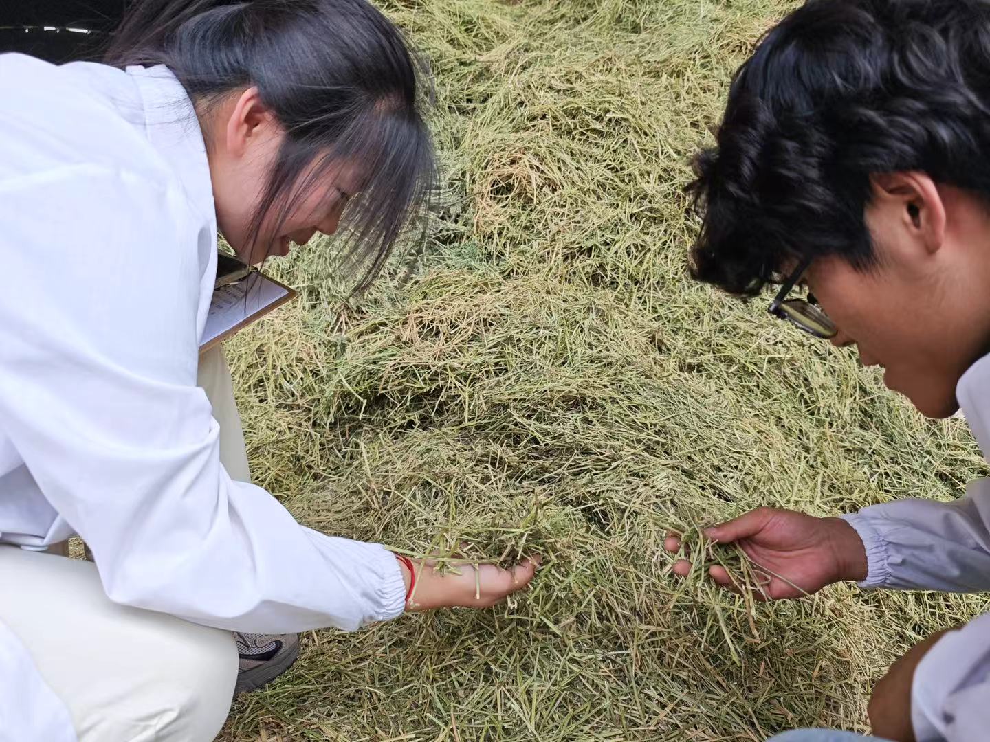 图为团队成员评估青贮饲料质量。曹文举供图