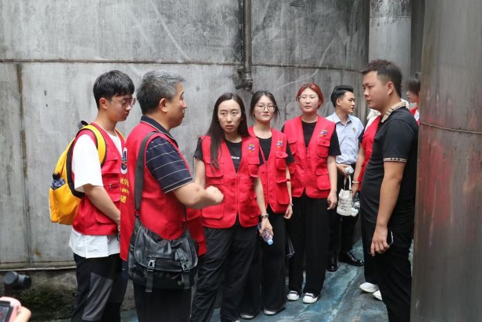 图为实践团成员参观父传子酒业酱酒密闭发酵储存罐(夏茂程 供图)