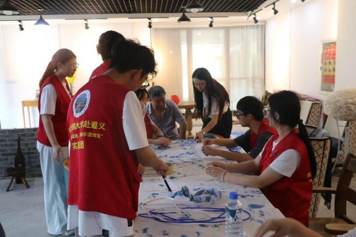 实践团首先抵达仁怀市父传子酒业有限公司,深入酱酒酿造核心,学习“12987”传统工艺精髓。实践团成员近距离观察制曲、发酵等工序,亲身体验劳作,在汗水与酒香的交织中,真切感受到赤水河畔匠人对每一道工序的敬畏,以及数十年如一日坚守古法的执着。离开酒业公司,实践团前往遵义市文化馆非遗展区。展厅内,色彩绚丽的苗绣缀满精致纹样,经纬交织的竹编勾勒出灵动造型,一件件非遗瑰宝静静陈列,让成员们不时驻足赞叹,纷纷拿出手机记录这份匠心之美。最后,团队来到汇川大院研学实践教育基地,实践团成员沉浸式体验贵州民俗文化,动手学习剪纸技艺,尝试蜡染制作,体验非遗苗绣,在亲身实践中加深了对多彩民族风情的理解。