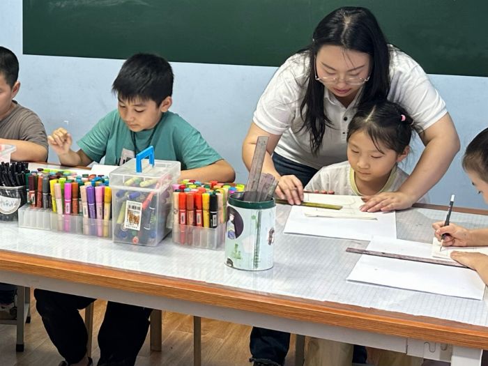 图为实践团成员为小朋友讲解绘画细节。侯振 供图