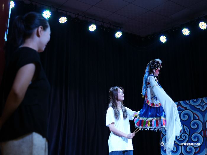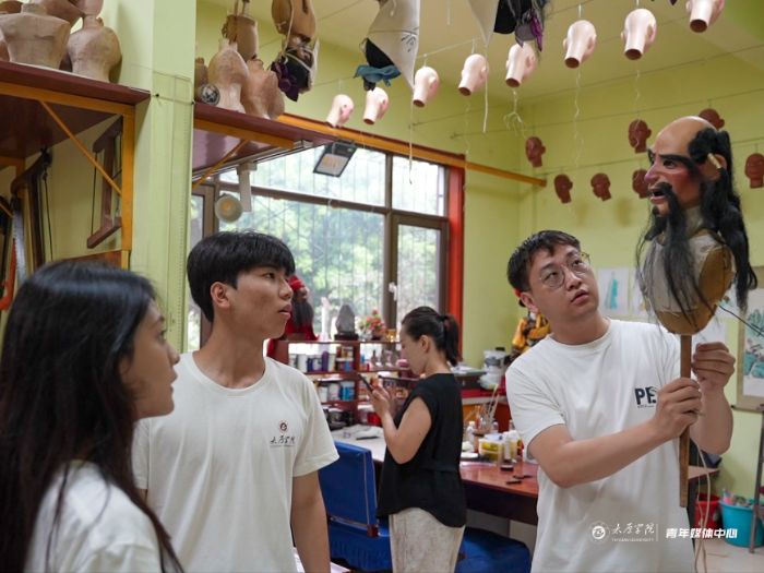 7月3日上午,实践队走进孝义皮影木偶剧团,深入探访两项国家级非遗。回溯皮影戏与木偶戏从乡音俚曲到非遗殿堂的百年历程,队员们亲手握住牵动古今的丝线,跟随老师的指法:拇指发力时木偶抬臂,小指微调时头部转动,实现“人随偶活,偶随人灵”。“一根丝线连古今”,当操纵的木偶在灯光下灵动起来,便是千年非遗与青春的生命对话。