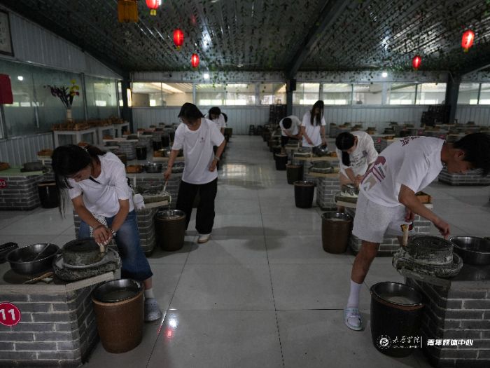 7月2日上午,实践队走进孝义南曹村,探访市级非遗豆腐传统手工技艺。传承人演绎选豆、泡豆、磨浆等工序,每步皆为匠人智慧的非遗结晶。队员们系上围裙尝试磨浆,木磨转动的沉重力道让手臂发酸,浆汁溅到衣襟上却笑得开怀。在笨拙操作中真切触摸到了从豆到腐的蜕变中蕴含的匠心,一粒黄豆承载的数百年记忆,在青年掌心有了温度。