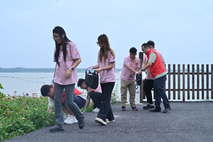 “护湖小队”集结于龙凤湖湿地自然保护区入口。经过简短的任务分配与安全提示后,队员们佩戴手套、手持垃圾袋,沿湖岸线展开“拉网式”清理。从亲水平台的塑料瓶、栈道缝隙中的食品包装袋,到芦苇丛里隐藏的烟头等杂物,都被一一“收入袋中”。行动中,队员们分工明确:有的负责重点区域垃圾捡拾,有的专注于垃圾分类打包,还有的主动向驻足游客讲解湖泊生态保护的重要性,呼吁“无痕游览”。