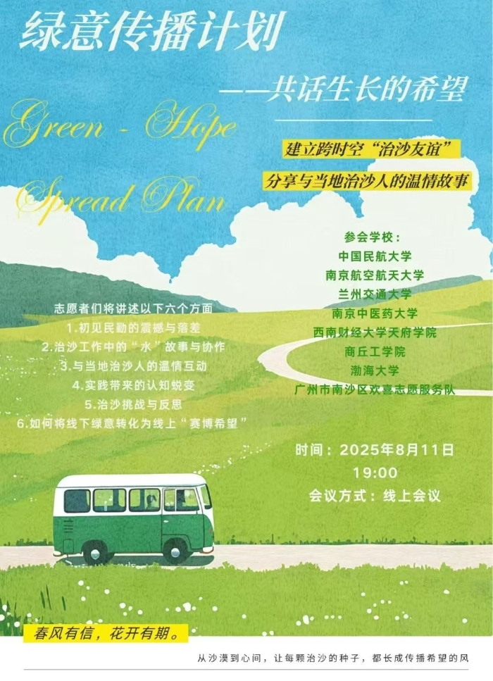 8月11日,“从民勤绿洲中探寻治沙精神”实践队还联合了多个高校和广州市南沙区欢喜志愿服务队展开故事和经验分享“绿意传播计划——共话生长的希望”线上圆桌会议。