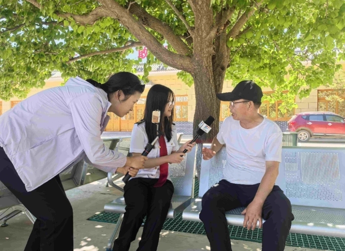 (图为实践队成员高默涵采访第二代治沙人程生学)