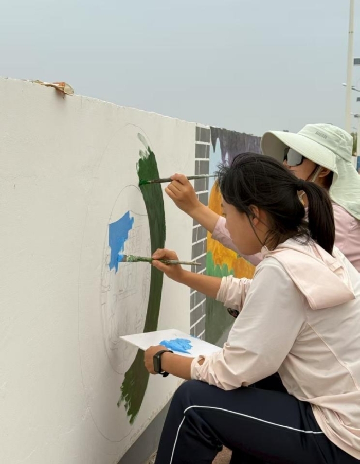 与此同时,第二分队的四位成员清晨便深入田间,体验蜜瓜采摘的辛劳与喜悦。随后转战红崖山水库,化身“艺术治沙者”,以画笔为武器,在水库墙面上精心绘制环保主题海报,用斑斓色彩为节水护水理念增添一抹亮丽风景。
