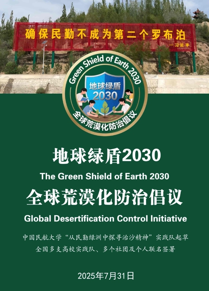 《倡议》是由中国民航大学“从民勤绿洲中探寻治沙精神”实践队草拟,于7月22日签署,7月31日正式发布。该倡议旨在宣传全球荒漠化防治行动,呼吁青年为全球荒漠化防治行动贡献力量。它以民勤“沙漠绿楔”生态地位为引,揭示防沙治沙的紧迫性;嵌入民勤人人治沙的动人故事,突出坚韧不拔接续相继的精神力量;并期望通过科研共享、实践协同、文化联结三大支柱将民勤经验升格为全球荒漠防治协作网络。实践队制作并于8月2日发表了相关宣传片。截至7月31日,已有43支高校实践队,8个高校环保类、公益类社团,4个地方公益发展机构共2600余人参加了倡议。