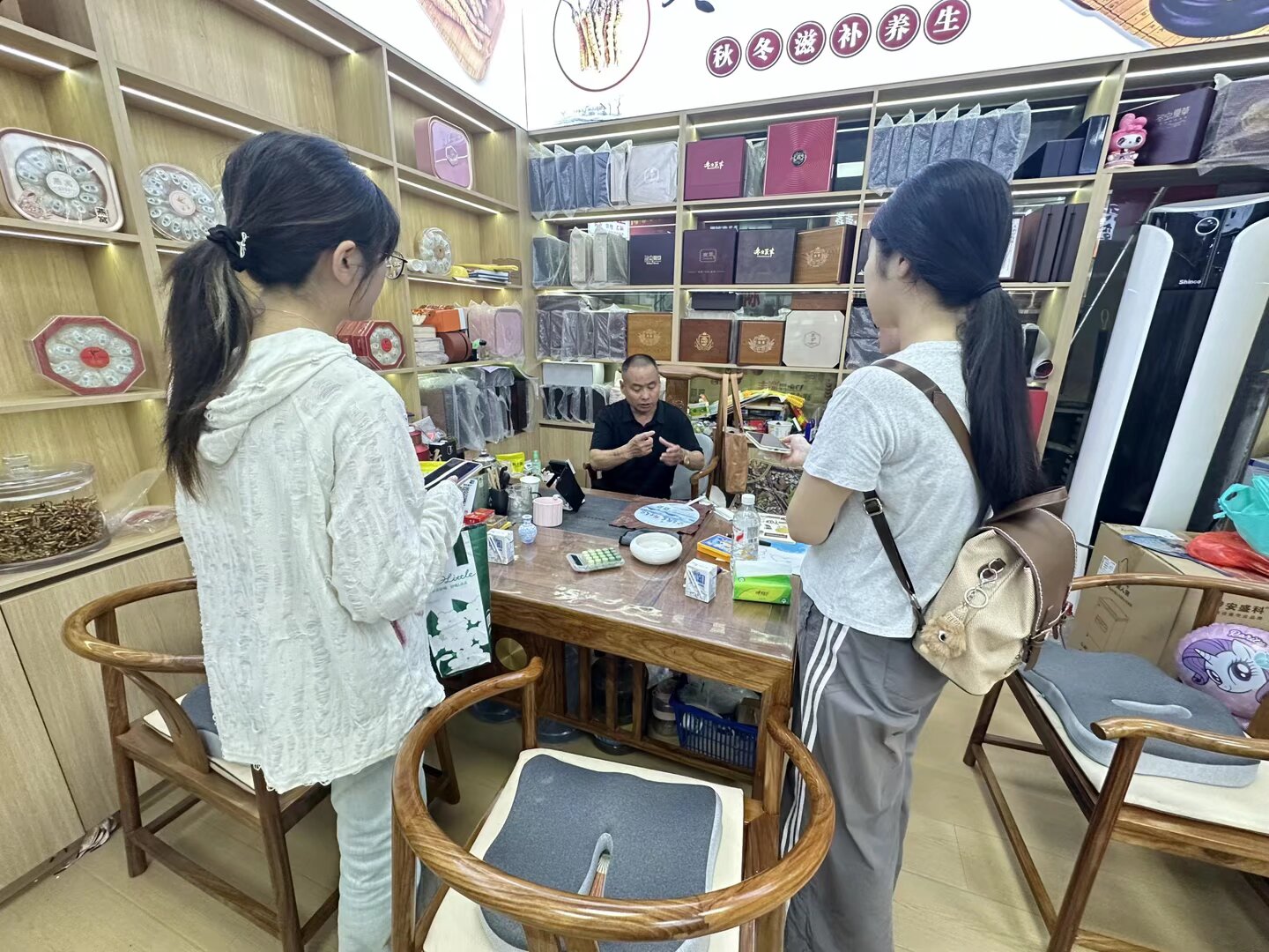 次日,实践团成员来到了康美中药城,对商户进行小摊小贩进行关于药材销售的调研,通过 与这些商家的对谈,实践团的成员们了解到,他们会通过线上推广药材的方式来进一步扩大 销售范围,从而让更多的人了解到亳州的药材同时也会推出一些中药手串等文创产品吸引更 多的游客。康美城一行,商户们线上售药、文创拓市,更借华佗文化赋能产业,让成员们明白:传统不是守旧,创新方能让中医药走得更远。