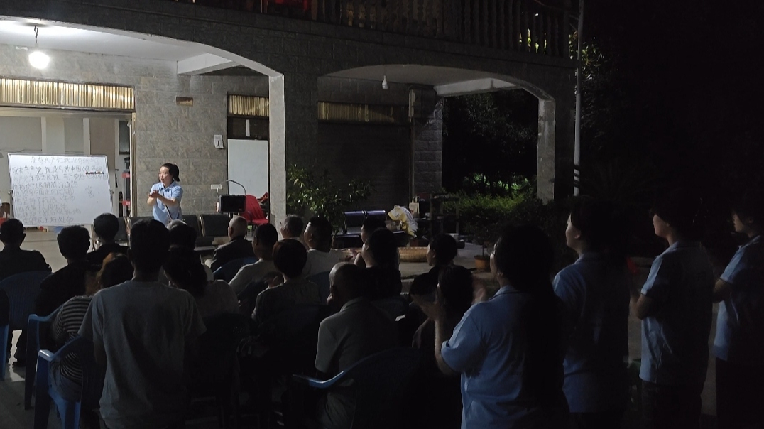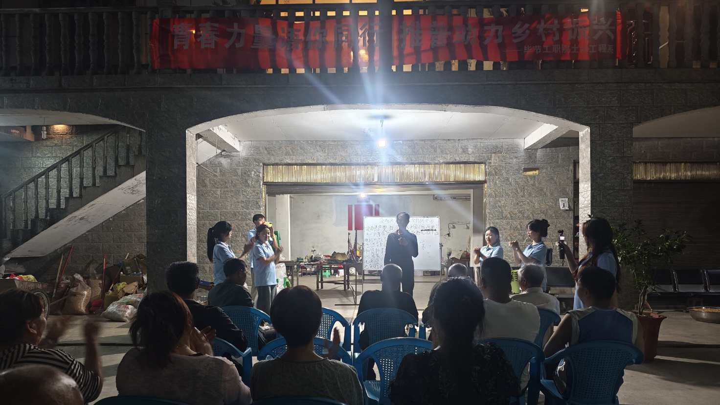 夜幕下,教学场地亮起温暖的灯光,村民们身着日常服装与身着蓝色队服的实践队队员们围坐成圈。前排几位年长者专注地看着歌词,实践队队员们身着蓝色队服站在身后,所有人的目光都聚焦在临时搭建的教学展板处。