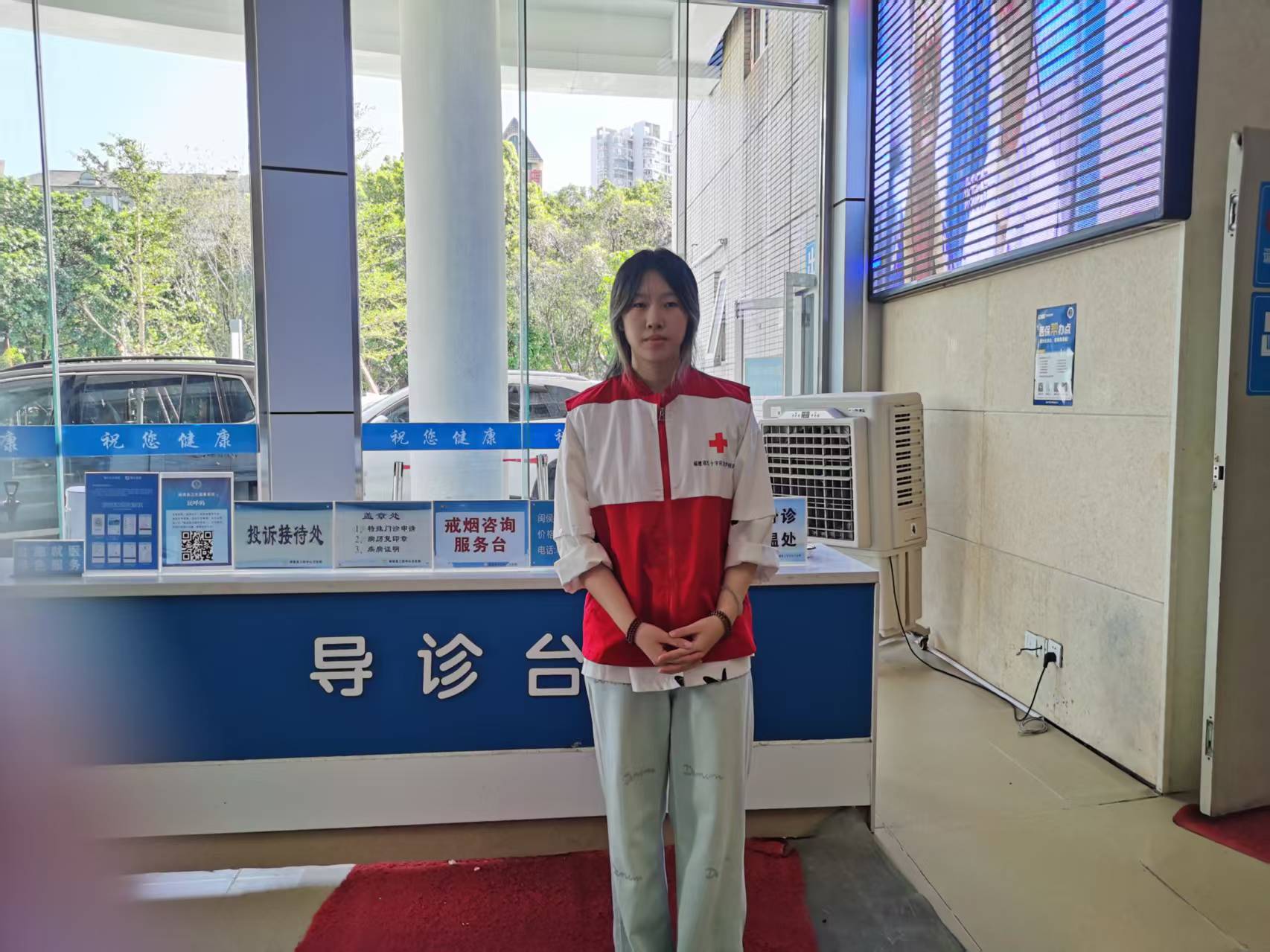 在医院导诊台,我身着红十字志愿者马甲,静静伫立。这里是患者踏入医院的 “第一站”,身旁的投诉接待处、戒烟咨询服务台等标识,彰显着为患者排忧解难的功能。我以热忱的姿态,随时准备为前来就医的人们指引方向、解答疑惑,用行动传递志愿温暖,助力就医流程更顺畅 。