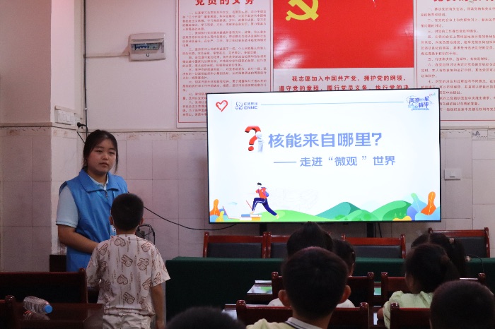 课程伊始,宣讲团成员熊金以提问的方式开场,迅速吸引了孩子们的注意力:“同学们,你们知道太阳为什么会发光发热吗?如果我们能在地球上制造出一个‘太阳’,那会怎么样呢?”带着这些疑问,孩子们被引入到“人造太阳”的奇妙世界。