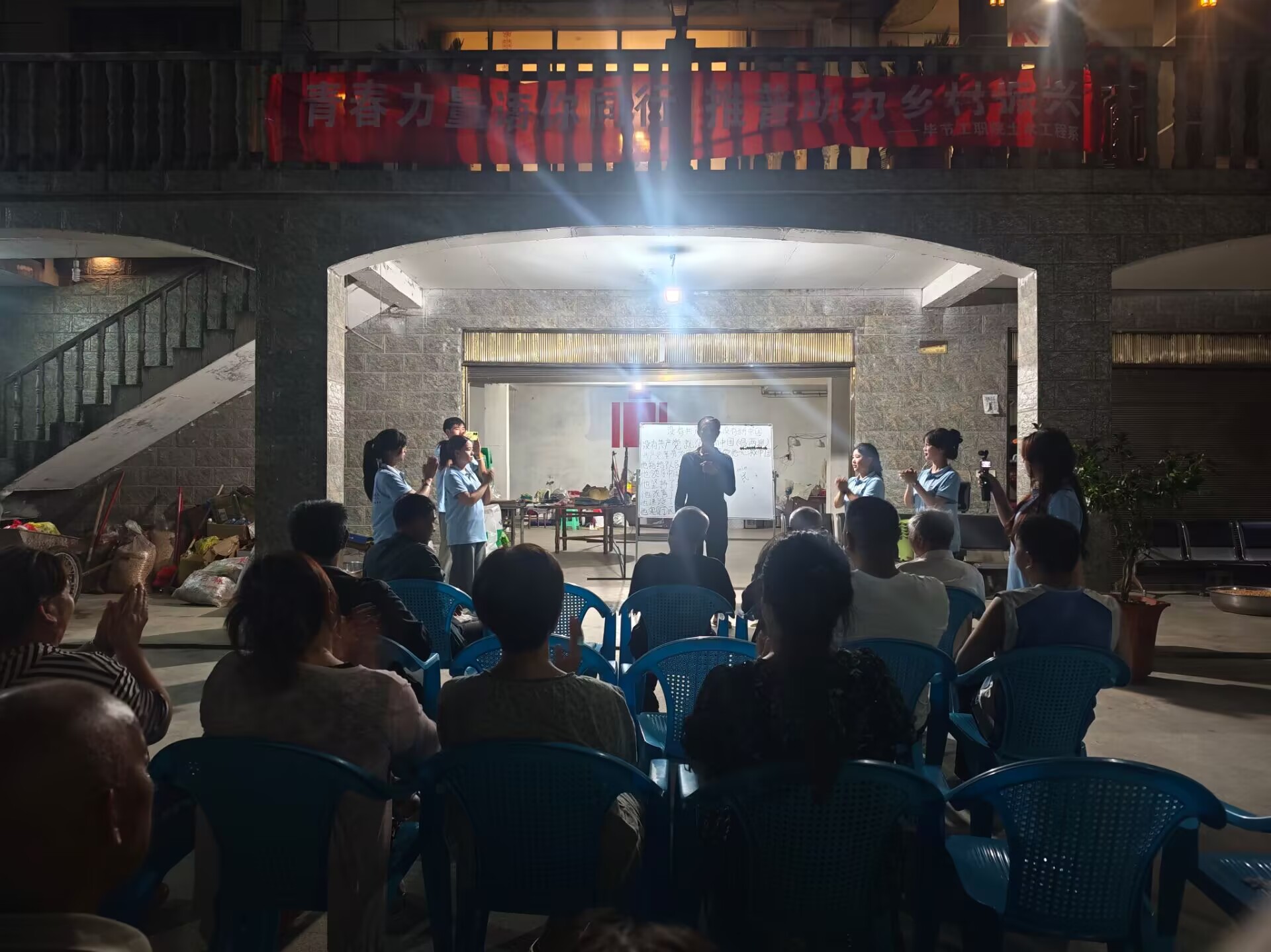 活动于夜幕中启动。实践队首先通过讲述党的历史事件,帮助村民唤醒红色记忆;随后进入核心环节,同步推进普通话教学与红歌学唱——以《没有共产党就没有新中国》为教学曲目,队员用标准普通话领唱,针对“持(chí,翘舌音)”“战(zhàn,翘舌音)”等村民易混淆的发音,逐字拆解示范,细致讲解边音、鼻音等发音规范,助力村民精准掌握。