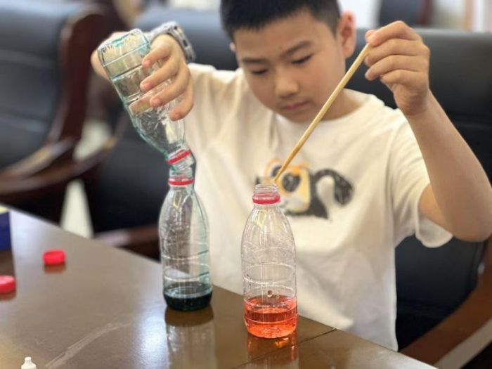 社区儿童认真进行彩虹杯科学实验