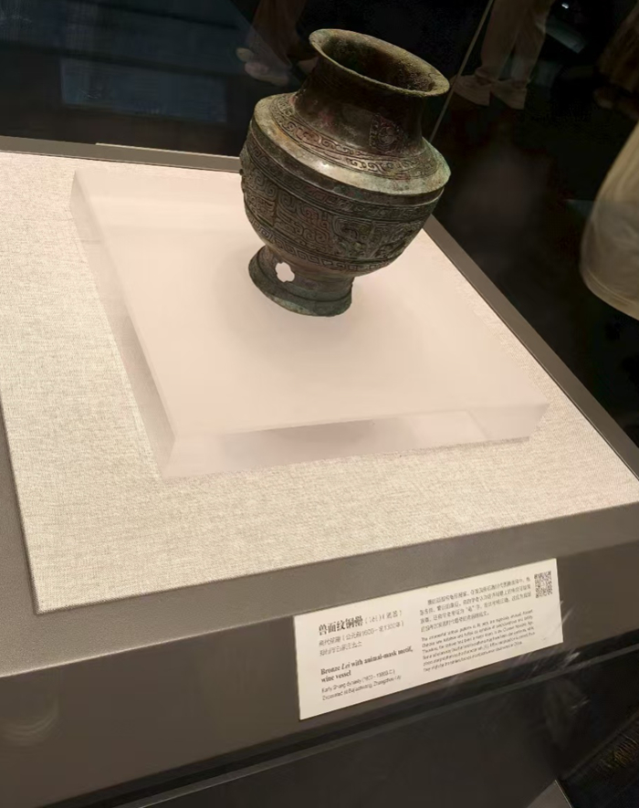 在河南博物馆展厅,商代兽面纹铜罍与杜岭方鼎等青铜器,成为团队解码历史的起点。面对兽面纹铜罍,讲解员用“古与今的守护”视角解读:“三千年前,它是祭祀礼器,承载着古人对天地的敬畏;今天,这种‘敬畏之心’转化为我们守护文化遗产、尊重自然规律的责任感,让历史智慧照进现实。”