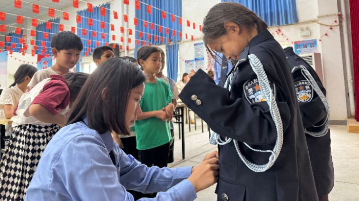 图为实践队队员左旭为试穿警服的小朋友整理着装(高羽迪 供图)