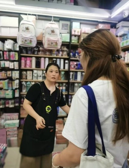 图为实践队员与一次性卫生用品店主交流访谈。通讯员 张美琪 供图