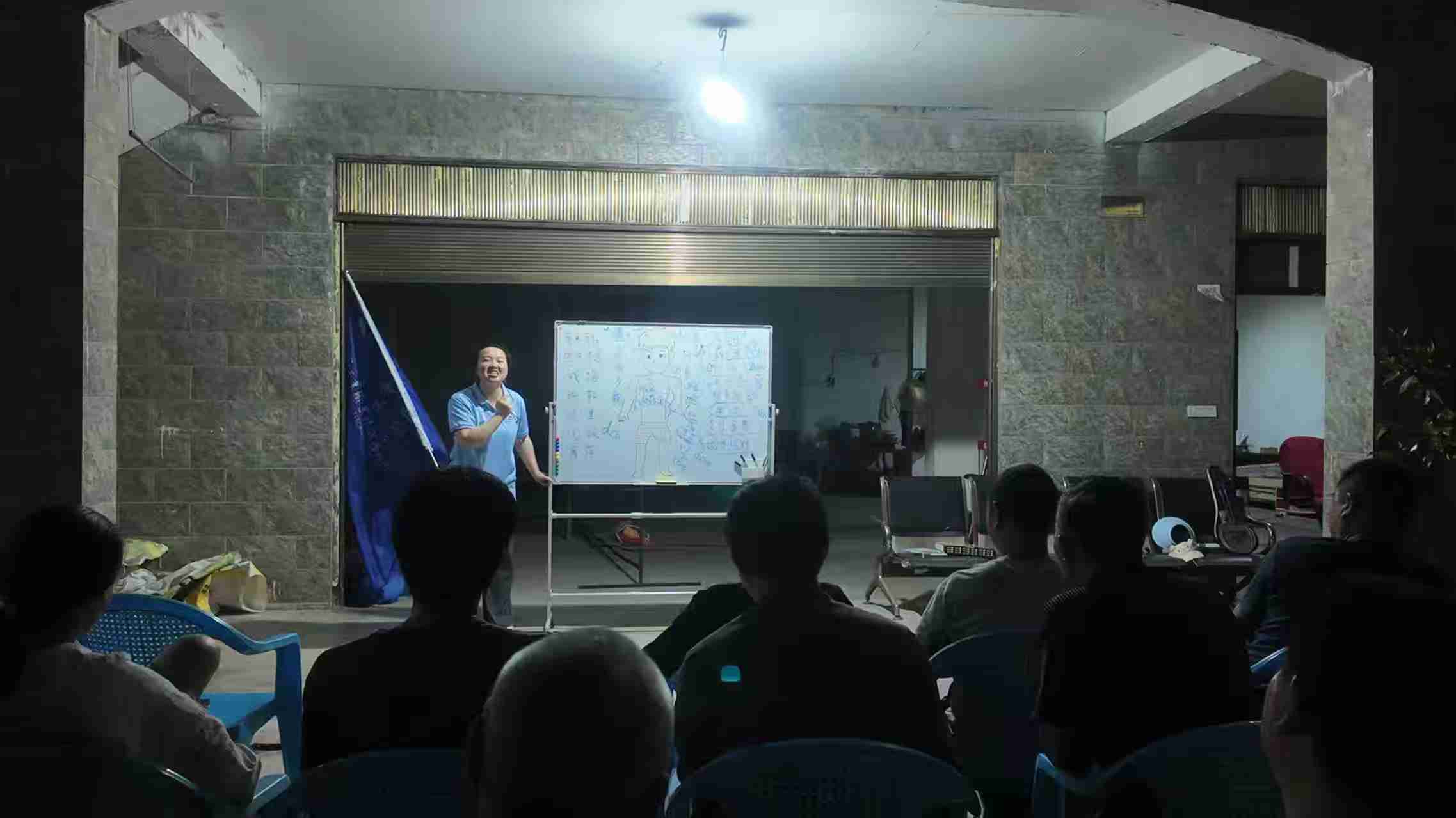实践队队员在白板前开展知识宣讲,围绕人体健康等内容为村民科普