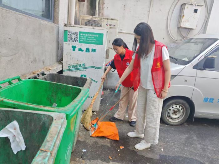 在南阳,队员们分成两个小组开展工作。一组同学走进社区,投身环境整治工作。他们拿起扫帚、簸箕等工具,仔细清扫路面杂物,对每一处卫生死角都不放过。在垃圾回收箱周边,队员们积极打扫卫生,为建设整洁、舒适的社区环境做贡献。