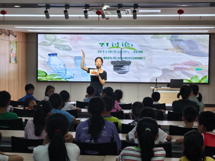 通过前期实践团在其余地区的调研和准备,8月21日,南通大学数学与统计学院“零碳π实践团”走进江苏省南通市狼山镇街道临江社区,面向社区儿童和家长开展了一场以“争当环保卫士,共护绿色星球”为主题的宣讲活动。这场活动以孩子的认知特点为出发点,通过互动交流、趣味问答以及实践体验,帮助孩子们了解环保知识,树立绿色低碳的生活理念,让绿色环保的种子在他们心中生根发芽。