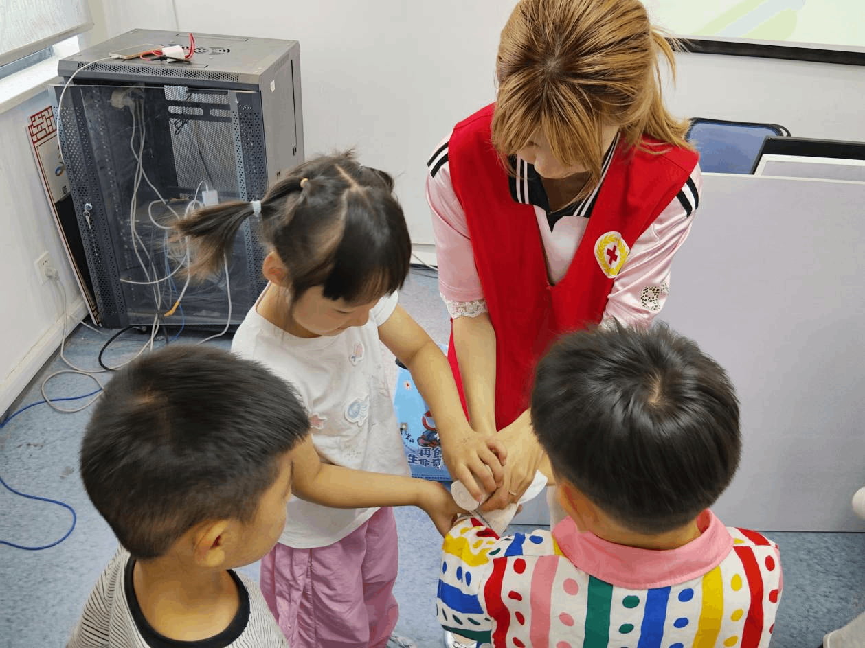 宣讲的最后关乎生命的“安全急救知识”实操课。“手臂要伸直,按压位置在胸骨中下段,频率是每分钟100-120次……”宣讲团的志愿者讲师半跪着,手把手地指导孩子们进行按压练习。讲师们聚焦生活中常见的突发状况,如异物卡喉(海姆立克急救法)、创伤止血与包扎技巧、烧烫伤及中暑的初步紧急处理等,进行了深入浅出的讲解和精准规范的动作演示。最受欢迎的是实操环节。孩子们在志愿者一对一耐心细致的指导下,轮流在模拟人上进行CPR按压,互相演练海姆立克急救法,认真练习三角巾和绷带的包扎方法。尽管动作稍显生疏,但每个人都全神贯注。“练习包扎真的有点难,但老师们特别耐心,一遍遍的纠正我们的动作。”满头大汗却笑容灿烂的李同学兴奋地分享道。现场社区工作人员由衷感慨:“这不仅教会了孩子们实用的急救技能,更是在他们幼小的心灵里深深播下了敬畏生命、乐于助人的种子。”