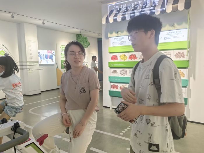 在上海碳秘馆的调研实践中,团队通过学习展区知识、参与互动体验设备以及采访馆内游客与工作人员,进一步深化了对低碳生活的认识。展馆中“衣食住行与双碳行动”主题展区展示了棉质衣物与化纤衣物的碳排放对比、节能家电与传统家电的能耗差异,以及公共交通与私家车的碳足迹数据。这些生动的案例让团队成员深刻意识到,低碳生活并非抽象的概念,而是藏在衣物选择、饮食搭配与出行方式的日常细节中。在“无废城市”主题展区,垃圾分解时间演示机器引起了团队成员的热烈讨论。通过机器展示,大家了解到塑料瓶自然降解需要数百年,而纸张仅需几个月,厨余垃圾在合理处理后甚至可以转化为有机肥料。这一直观体验让团队进一步认识到减少一次性用品、做好垃圾分类的重要性。