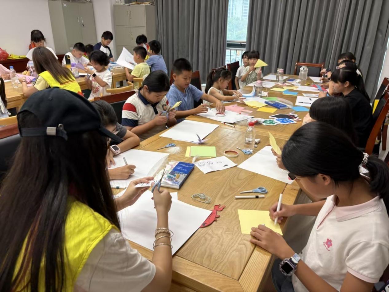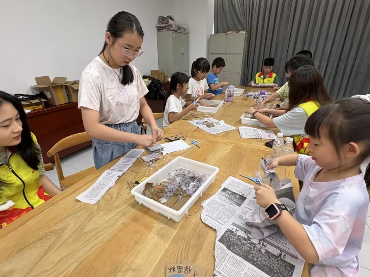 志愿者团队还将环保与非遗结合,讲解四大发明之一的造纸术,并介绍和平县本土的“阳明纸”历史。孩子们将前几日废弃的报纸、卡纸撕碎、打浆,亲手体验“废纸再生”,最终制成环保书签。非遗智慧与现代环保理念的融合实践,促进和平县的年轻一代真切感受到个人行动与社会生态的紧密联系。