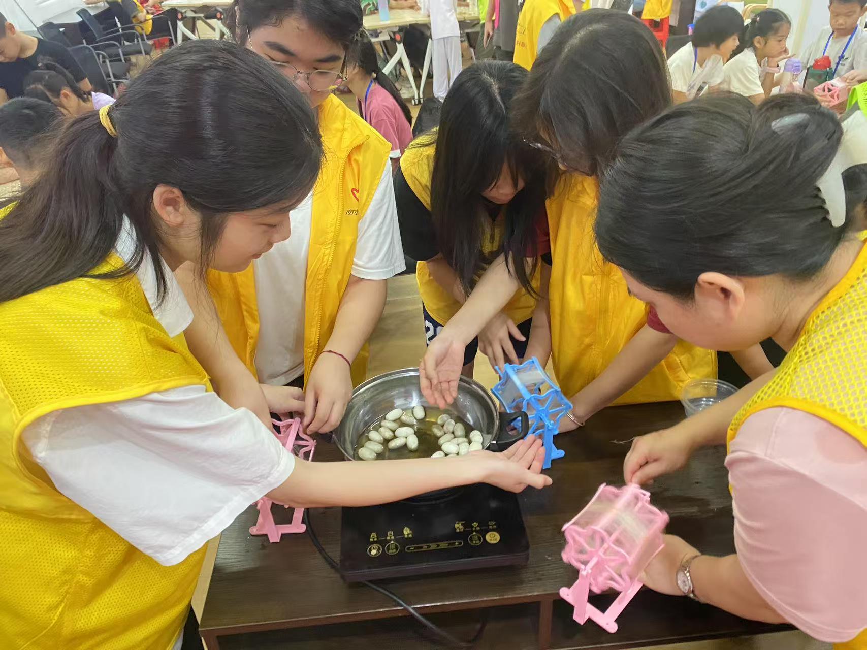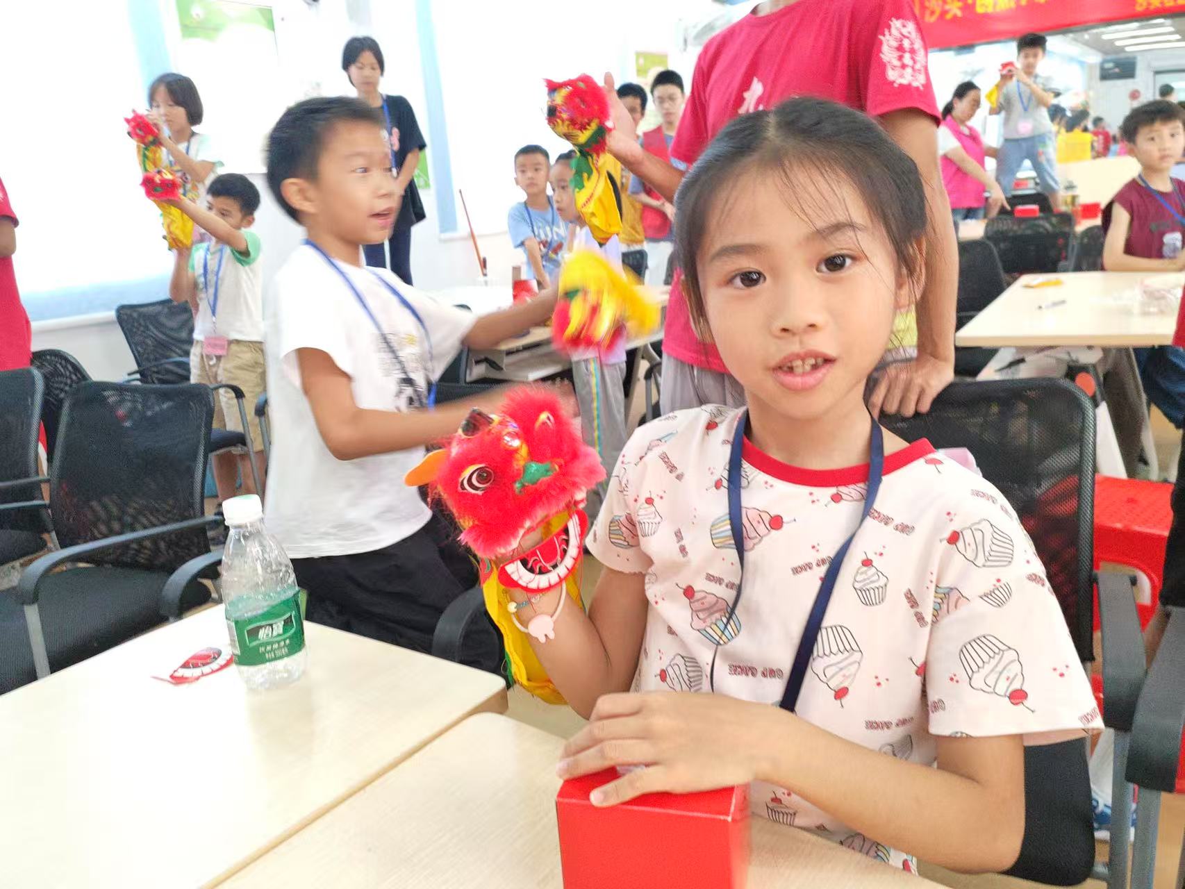 活动伊始,队员们联动社区,为孩子们打造非遗课堂。在蚕茧缫丝体验区,志愿者手把手教孩子操作传统工具,从煮茧到抽丝,志愿者们和孩子们在实践中通力合作,克服过程中的困难,让古老技艺在指尖“复活”;醒狮手工课上,孩子们亲手制作醒狮玩偶,然后热情地向伙伴们和志愿者们展示着自己的作品,有些孩子在做完后,自发举行了醒狮玩偶“选美大赛”。他们在醒狮玩偶挥舞间感受岭南民俗的热血与灵动,感受着中华优秀传统文化的魅力。非遗传承,不能止于技艺传授,更要让孩子们有发自内心的热爱,在他们心底播撒文化自信的种子。