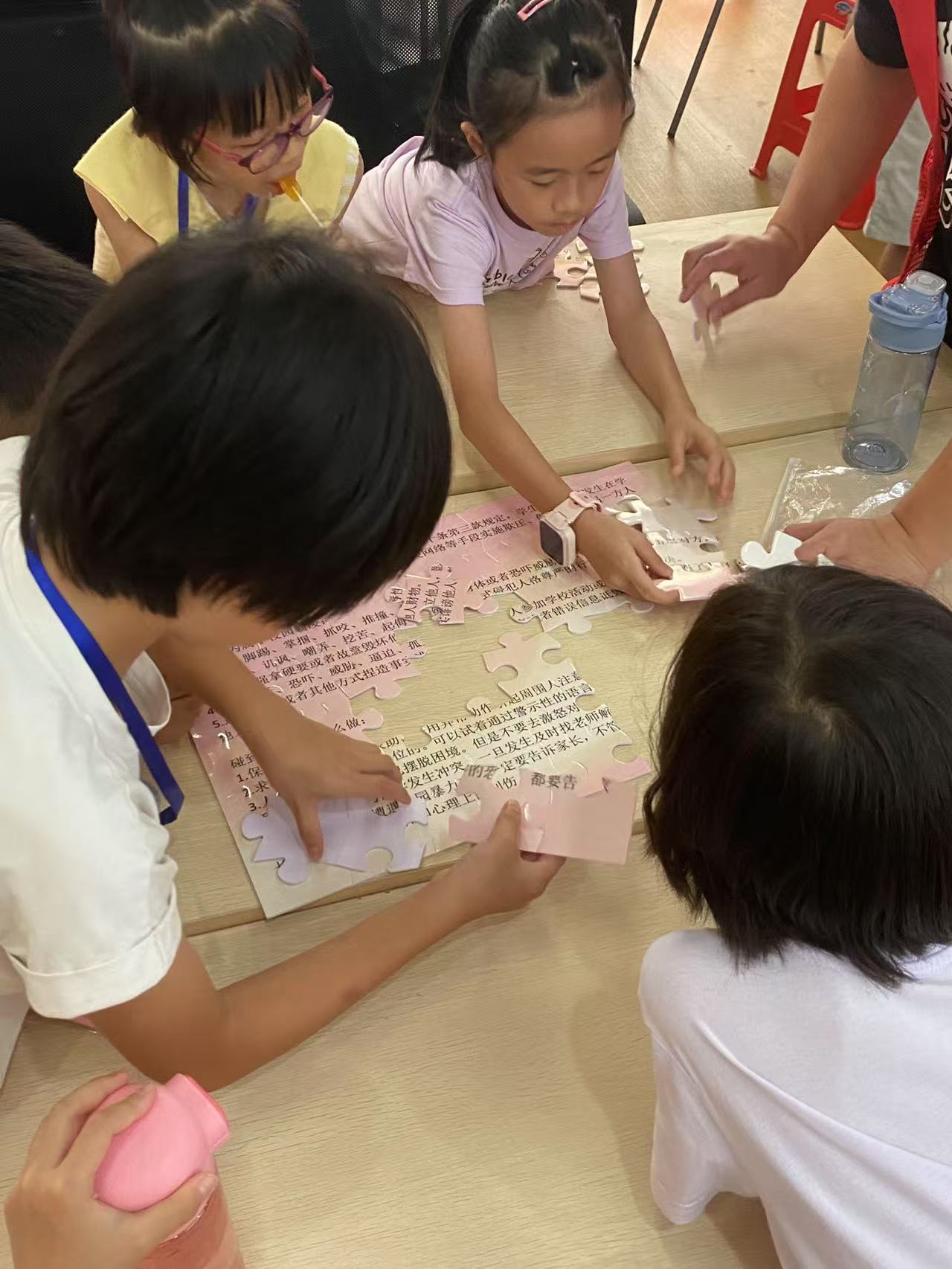 “法者,治之端也。”在进行非遗宣传之后,服务队又创新开设趣味法治课堂,用动画故事、情景模拟的方式深入浅出地讲解法律知识,并且依据动画故事进行了有奖问答活动,孩子们在拿到奖品的同时,还可以巩固从动画中学来的法律知识。志愿者们还定制了法治小拼图,将反诈等法律知识要点融入其中。孩子们在拼装时,积极了解并参与对“不明号码提额度”“网上中奖先交钱”等诈骗套路的讨论,在趣味互动里,把“凡是刷单、要求转账的 都是诈骗”等知识牢记心间。从“校园安全守护”到“网络诈骗防范”,志愿者们将晦涩法条转化为生动实践,互动问答时,孩子们踊跃发言,积极回答问题,法治意识悄然扎根,为成长筑牢“防护墙”。