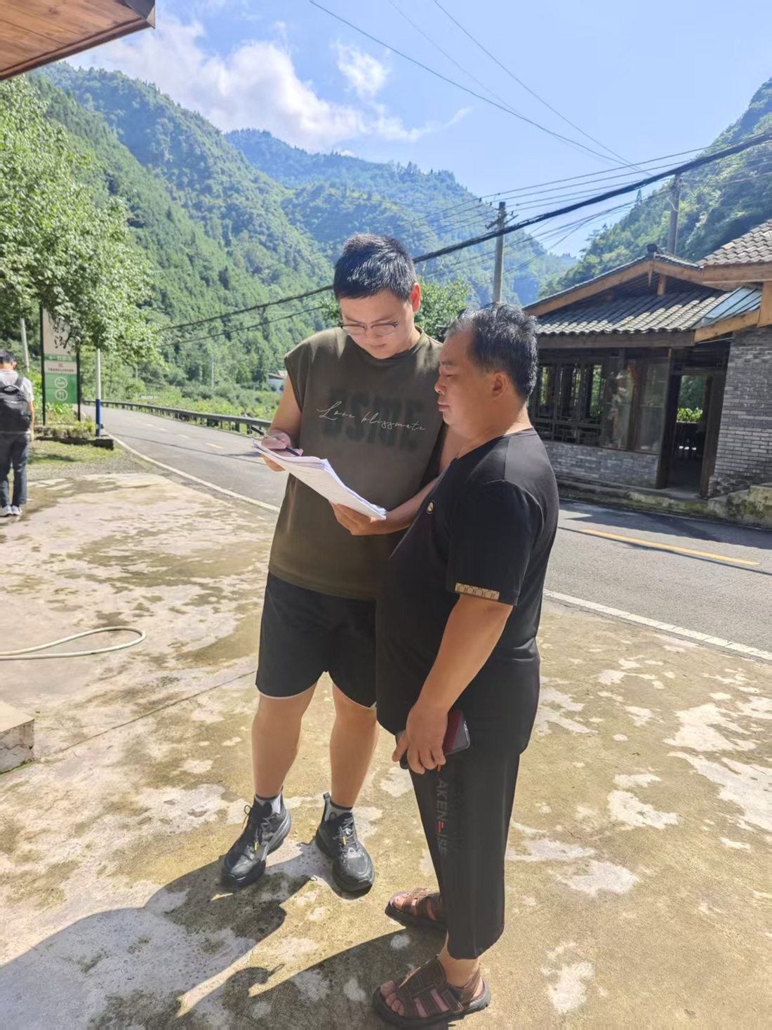 图为实践团成员在乡村山野间道路开展实地调研。李方摄