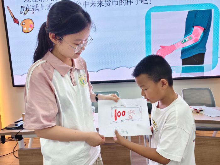 “天圆地方,货币通神。”在钱币简史课堂上,那些拓印于人民币上的桂林烟波、泰山朝暾,恰似一扇扇文化之窗——孩子们在辨认风景地标的过程中,既理解了“钱帛通神”的金融本质,更读懂了“山水载道”的文明密码。他们充分发挥想象力,融合科技、环保、家乡特色等元素设计的“未来货币”,既是对“量入为出”理财观的具象诠释,更是对“器以载道”传统美学的当代演绎。