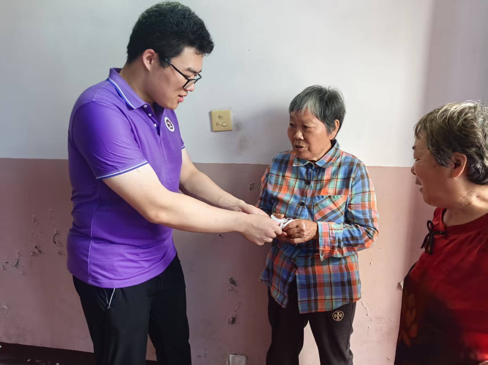 | (图为7月15日,“银龄筑梦臻关爱,杏林护煦焕晴晖”团队成员高瑞浦将香囊赠予建华村的李奶奶。高瑞浦供图) |