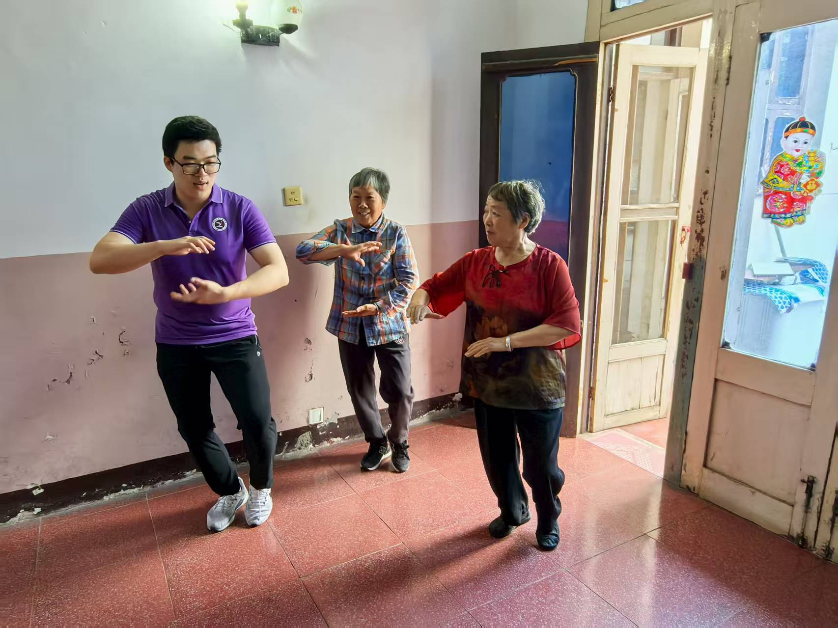 | (图为7月25日,“银龄筑梦臻关爱,杏林护煦焕晴晖”团队成员高瑞浦教建华村张奶奶和李奶奶太极“野马分鬃”动作。高瑞浦供图) |