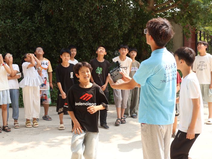 无人机课程的准备远比想象中复杂。学校没有专用场地,成员们便每天提前半小时清理操场的碎石;电池续航不足,他们就轮流骑车回驻地充电;有孩子害怕机器轰鸣,一位成员特意编了“无人机送信”的故事,让飞行器载着画满笑脸的卡片飞向学生。看到留守儿童小鹏露出笑容时,操作无人机的成员调整了飞行轨迹,让卡片在他头顶多盘旋了两圈。小鹏接住卡片后,涨红了脸小声说:“老师,这是我第一次见无人机,真好玩。以前只在电视上见过,没想到能亲手摸到。”