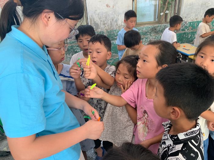 坚守奉献:克服条件传递热情 虽然教学条件有限,黑板斑驳,课桌椅高矮不一,有两个年级还未配备多媒体,但这并未阻挡成员们的支教热情。成员们用带来的彩纸装饰墙面,把矿泉水瓶剪成笔筒,在操场角落开辟出简易的体育角。没有多媒体设备的班级,他们就用粉笔画出太阳系;缺少乐器,就教孩子们用树叶吹简单的旋律。有个男生在劳动课上,把自己种的小盆栽搬到了成员的办公桌上,盆栽里还插着一张写着“谢谢”的小纸条,他说:“老师教我们种东西,还告诉我们怎么浇水和养护。”