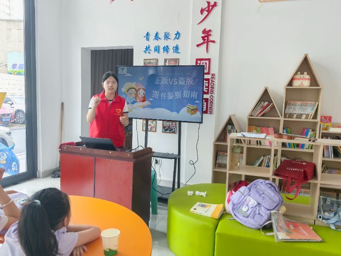 午后,“湖北精神”思政课率先开讲。志愿者以“一粒花生燃星火(大别山精神)、一袋沙土筑长堤(抗洪精神)、一袭白衣护苍生(抗疫精神)”为脉络,用故事串联精神传承:讲大别山“红旗不倒”的革命坚韧,展98抗洪时“人墙筑堤”的热血震撼,忆新冠疫情中“逆行守舱”的温暖坚守。孩子们瞪圆双眼,时而随红色故事屏息凝神,时而踊跃举手宣誓:“长大后要像抗疫叔叔阿姨一样守大家!” 紧接着,正盗版图书鉴别课拉开帷幕。志愿者捧来十余本对比样本,现场传授“三招辨真章”:摸纹理——正版纸张细腻柔韧,盗版粗糙发涩;辨印刷——正版字迹清晰匀整,盗版墨色晕染模糊;查细节——正版排版严整,盗版常现页码错乱。“这本绘本字边有毛边,是盗版!”小朋友们围拢观察,指尖轻触纸面,争先指出差异,在“打假实践”中识破伪装。