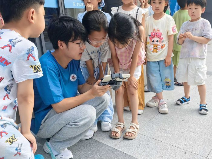 图为无人机科普课上,志愿者给孩子们展示无人机操作方法。邱畅摄