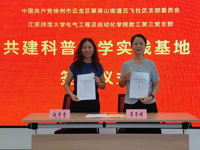 图为结业仪式上,云飞社区党支部书记赵青青与江苏师范大学电气学院李荣婧书记进行现场签约。邱畅摄