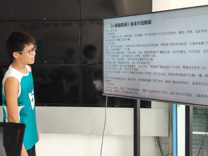 图为在麦楼社区,孩子朗读《小英雄雨来》经典片段。包程艺摄