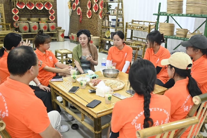 一踏入产品部办公室,清幽竹香萦绕,宛如一首无声的民谣,诉说着竹编的前世今生。环顾四周,琳琅满目的竹编制品令人目不暇接。从精巧竹篮上细密如织的万字纹,到符合人体工学设计的竹椅,再到保留天然竹节肌理、光滑似镜的竹桌,无一不展现着桃江竹编的独特魅力。队员们轻轻摩挲着竹抱枕,细腻温润的触感传递着老篾匠指尖的温度。凑近端详,细若发丝却坚韧无比的竹丝,在光影下闪烁着智慧的光芒,“一挑一压”的古老技法,编织的不仅是物件,更是岁月沉淀的乡土记忆。这一刻,队员们真切感受到,非遗并非遥不可及的历史符号,而是鲜活融入生活的智慧结晶。
