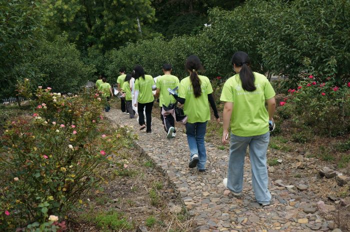 图为实践团在余主任的带领下穿梭于万亩茶山间。储炙阳 供图
