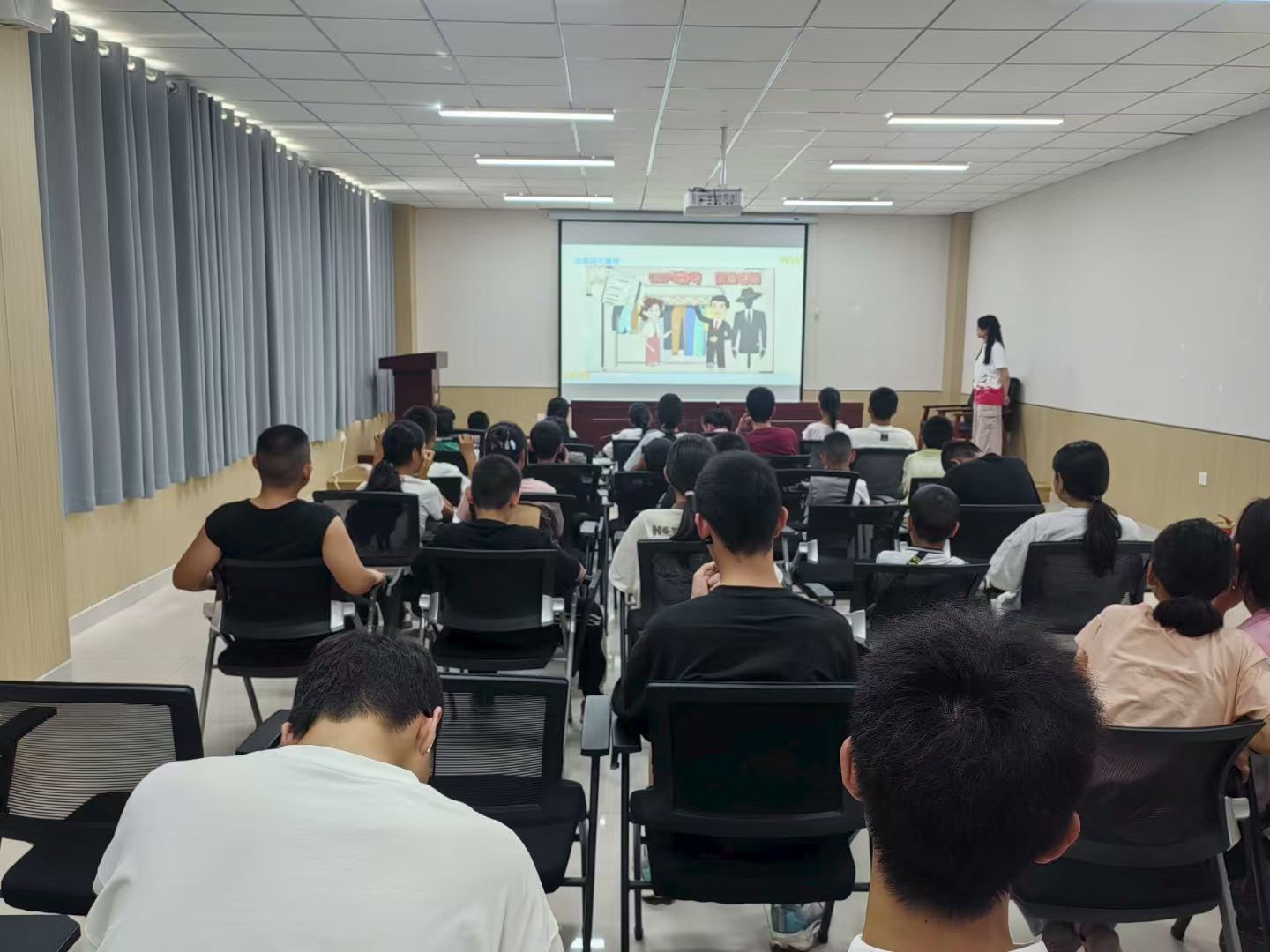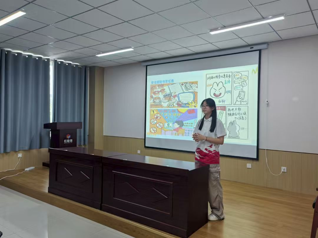活动伊始,主讲人唐思宇聚焦青少年日常生活中常见的网络风险——从“中奖链接”“冒充亲友求助”等典型诈骗手段,到暴力、低俗等不良信息的识别技巧,讲解用真实案例结合动画演示,将抽象的安全知识转化为易懂的生活指南,让大家清晰掌握“如何避坑”“怎样自保”的实用方法。