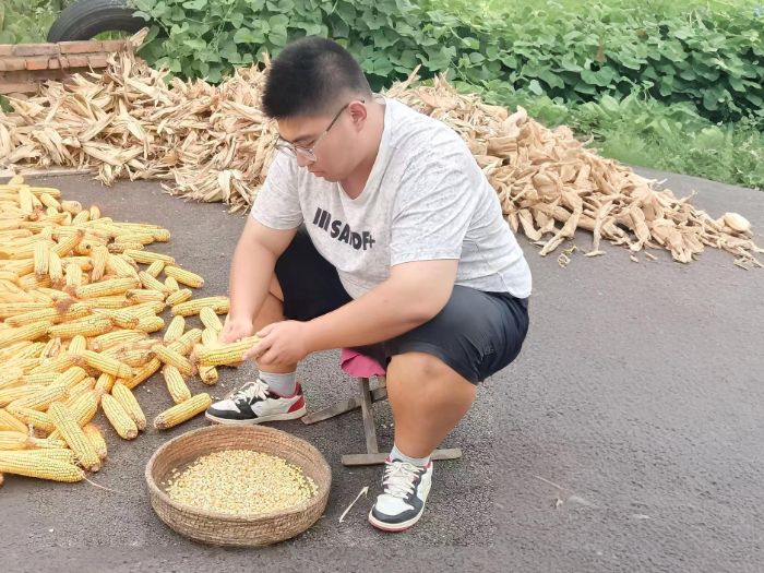 几名实践团成员早早来到村北的玉米地,协助村民进行田间劳作。实践团成员在村民的指导下完成掰玉米、装袋、搬运等工作。虽然当天气温接近三十五摄氏度,但大家仍坚持作业近三个小时,完成了玉米地的清理。