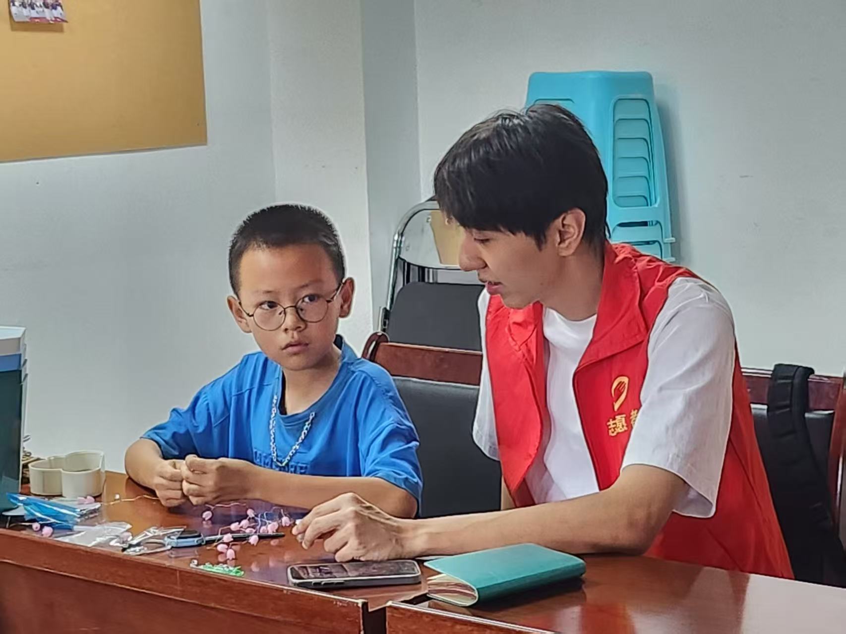 活动首日,实践团成员在社区活动室与数十名小学生见面,按照年级分组开展课业辅导。孩子们围坐在桌前,认真完成美术作业,成员们耐心指导学生,教室内不时传来轻声讨论和翻书声。